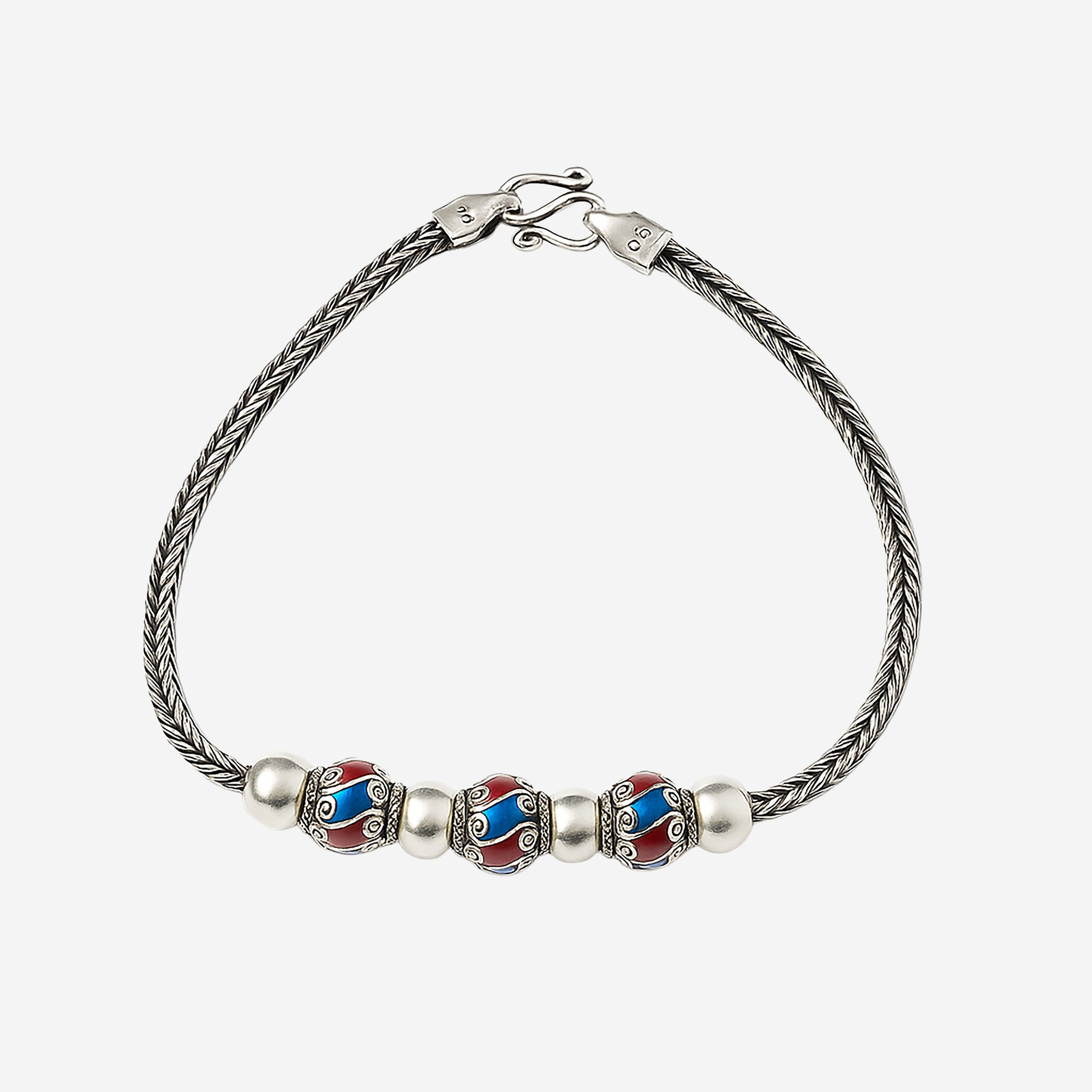 Elevate your wrist with this striking enamel bracelet, featuring vibrant red and blue balls separated by sterling silver balls. The contrasting colors create a bold, eye-catching design that transitions seamlessly from casual to sophisticated occasions.