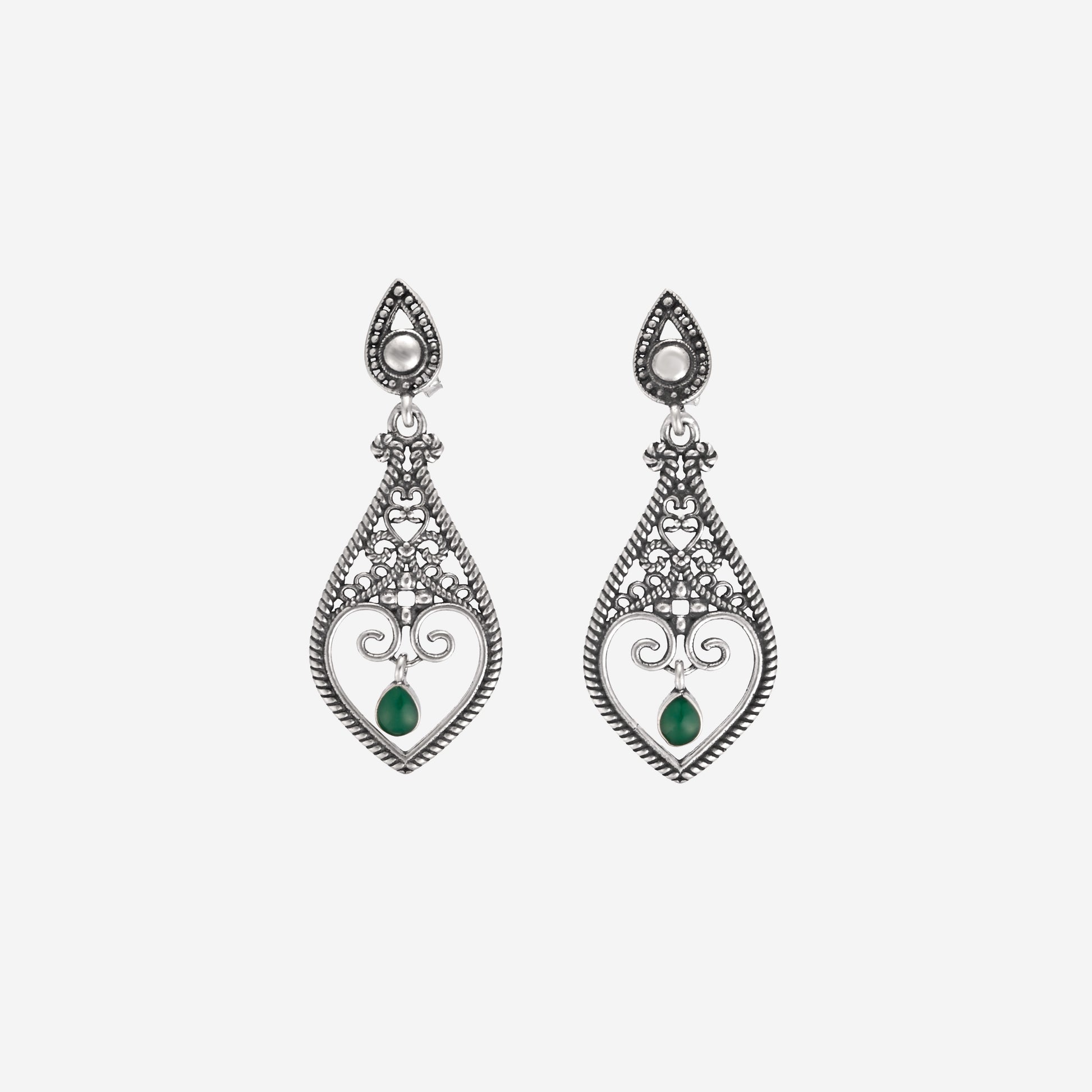 Delicate filigree craftsmanship meets timeless elegance in these stunning 925 sterling silver earrings. Each piece features an intricate heart-shaped design adorned with a gracefully suspended stone that catches the light as you move. The fine filigree detailing showcases traditional silversmith artistry, while the dropping stone adds dimension and sophistication.