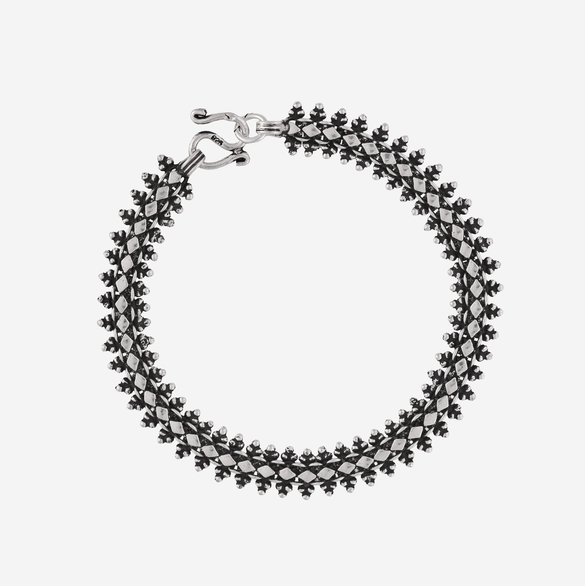 Elevate your everyday elegance with this delicate 925 silver bracelet, featuring a sophisticated rhombus pattern adorned with intricate floral dot detailing. The soft, fluid design creates a graceful silhouette that complements any wrist, while the timeless geometric design add a touch of refined charm.